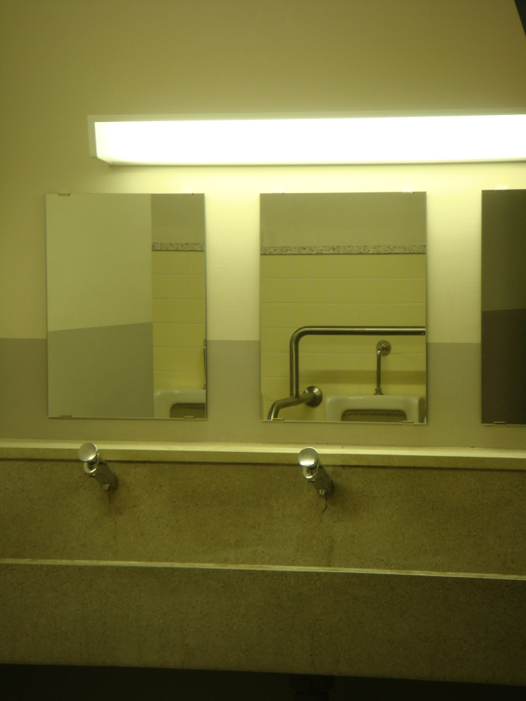手洗い場に鏡が取り付けられ、蛇口が押すと一定時間水が出るプッシュ式に交換された。