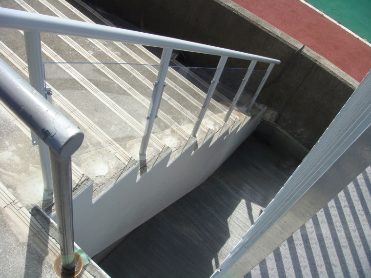 新設された階段部分の柵には転落&落下物防止用のアクリル板が貼られた。