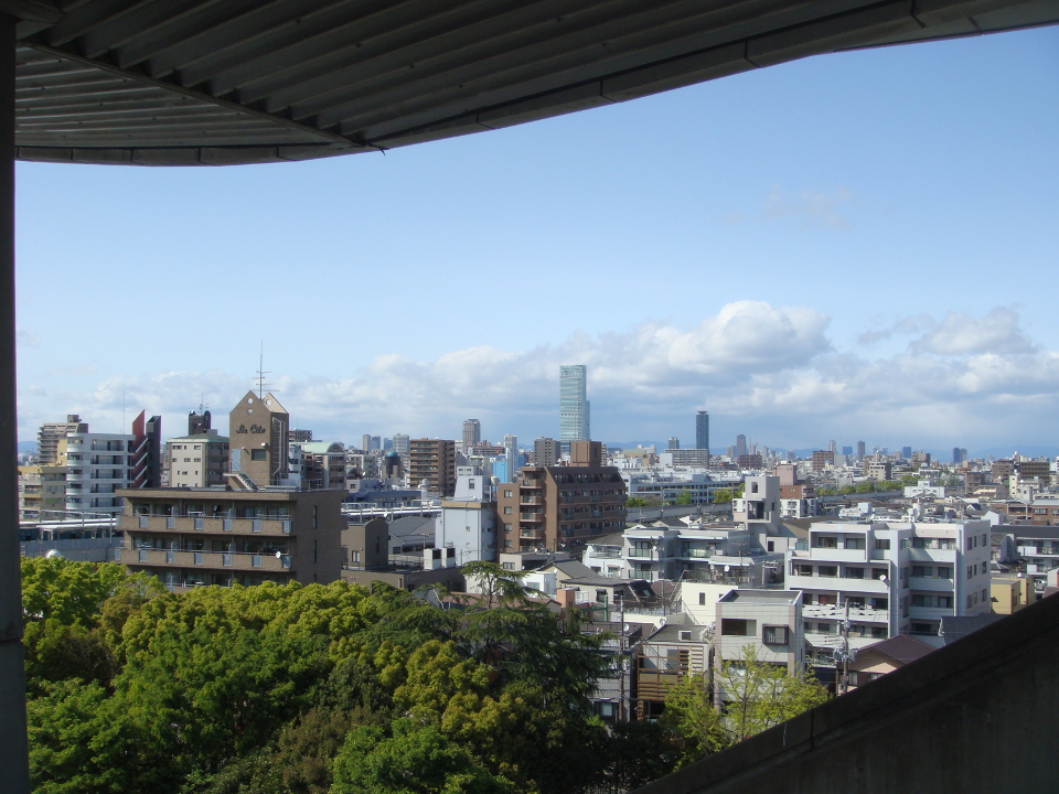 メインスタンド上段からは高さ日本一を誇るビル(2013年4月現在)『あべのハルカス』も見える。